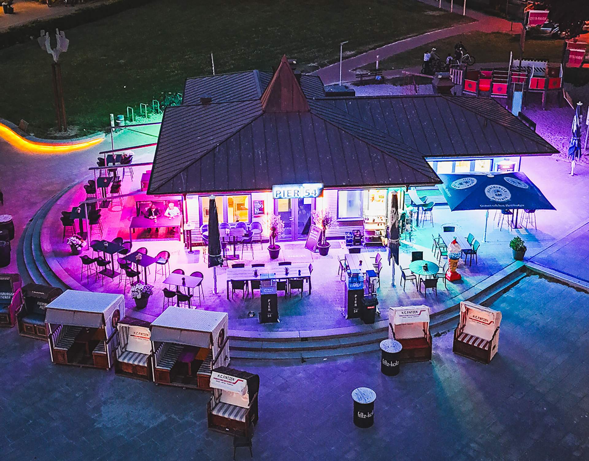 Unser Spielplatz grenzt direkt ans Pier. Erlebe die besondere Stimmung, besonders an warmen
